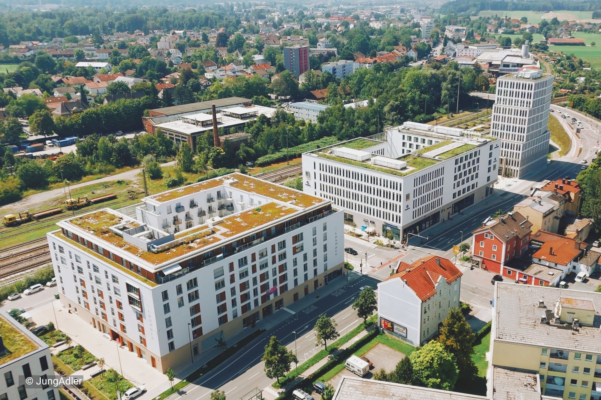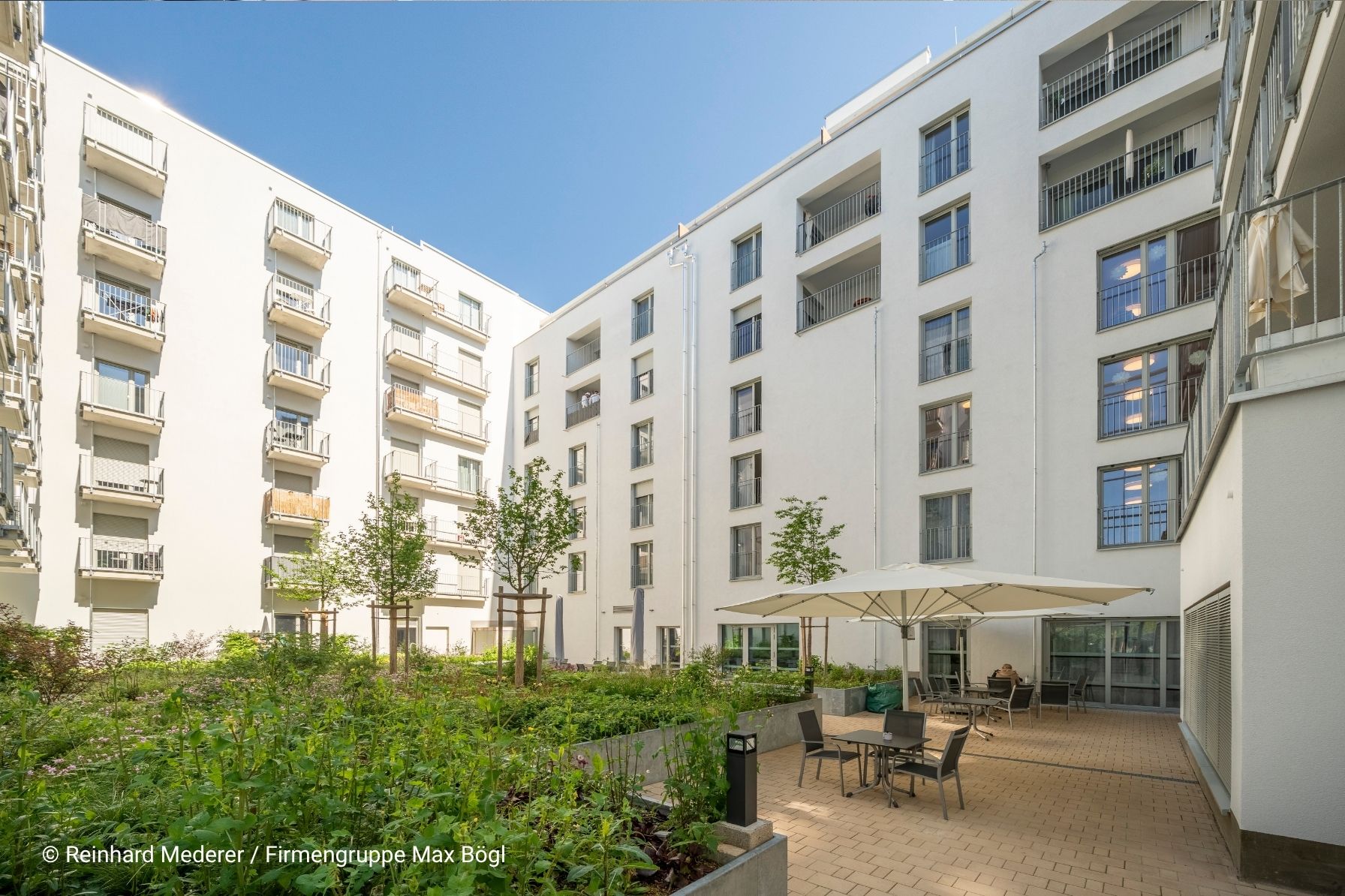 Die Wohnanlage selbst bietet einen geschützten, begrünten Innenhof, der Entspannungs- und Begegnungsmöglichkeiten zwischen den Generationen ermöglicht. Die gesamte Bebauung ist in ein umfangreiches Begrünungskonzept gebettet, das als verbindender Baustein des Quartiers fungiert und mit Dachgärten, Innenhöfen und urbanen Plätzen eine Vielzahl privater und öffentlicher Grünräume schafft.